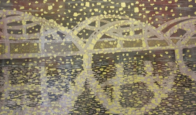 “Chuyển nhịp cùng Hương” của nữ họa sĩ Nguyễn Thị Huệ là một trong những tác phẩm đặc trưng cho phong cách Huế: nhẹ nhàng, mềm mại và sâu lắng. Bằng chất liệu lụa tổng hợp, tác phẩm thể hiện cách điệu hình ảnh cầu Trường Tiền lấp lánh sắc vàng. Sự phá cách về kỹ thuật tạo hiệu ứng chiều sâu, hòa sắc đẹp cho tác phẩm. Với bức tranh này, dường như cả trời, đất, mây, nước hòa vào nhau trong không gian đặc trưng của Huế.