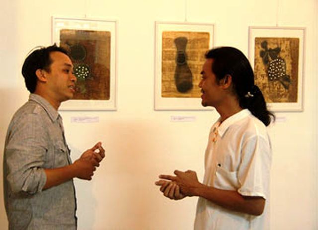 Nghệ sĩ Pornsawan Nonthapha (bên phải) đang trò chuyện với khách xem triển lãm