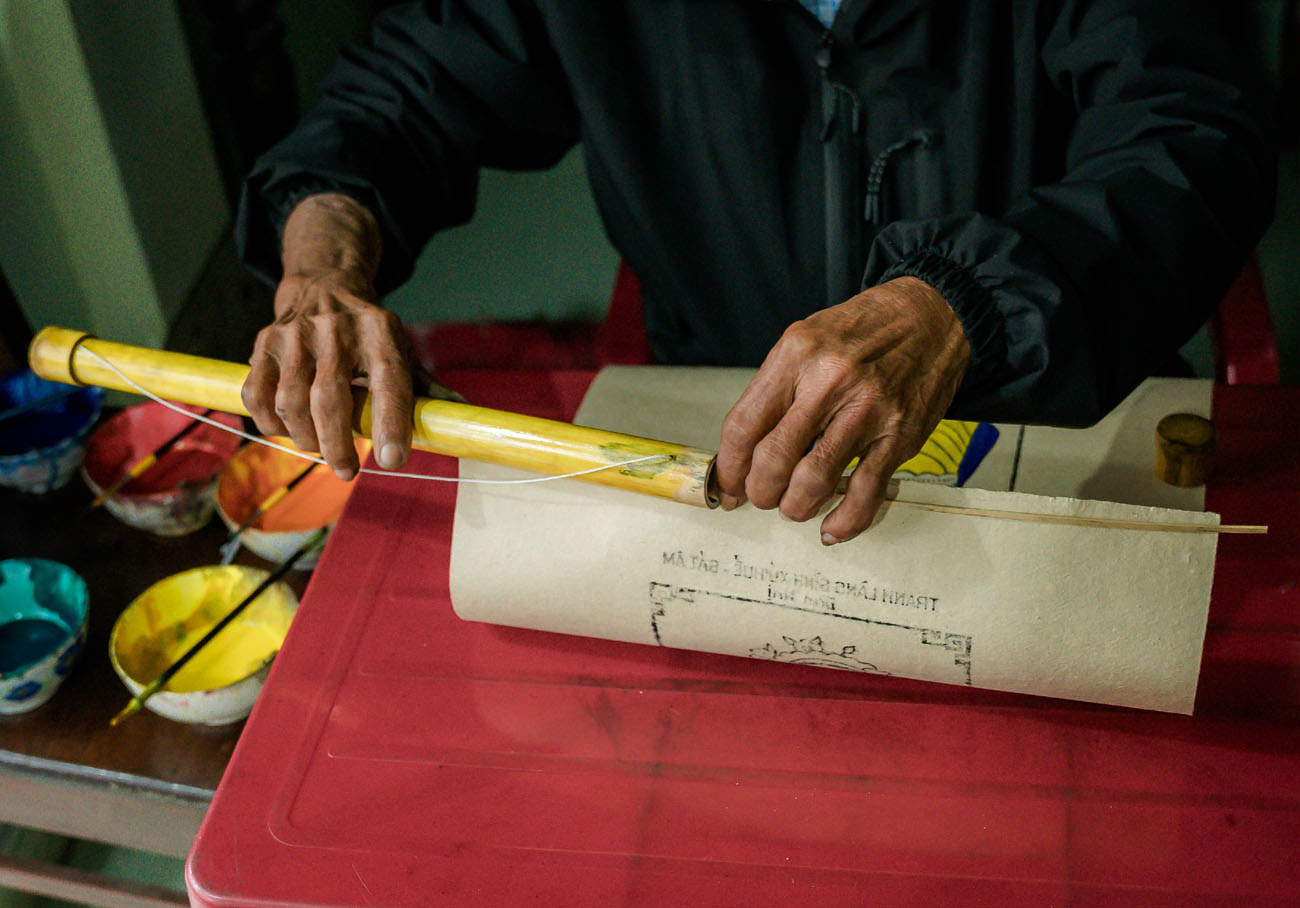 Tranh được nẹp tre, cuộn bỏ vào ống tre truyền thống, vừa tiện di chuyển vừa bảo quản tốt