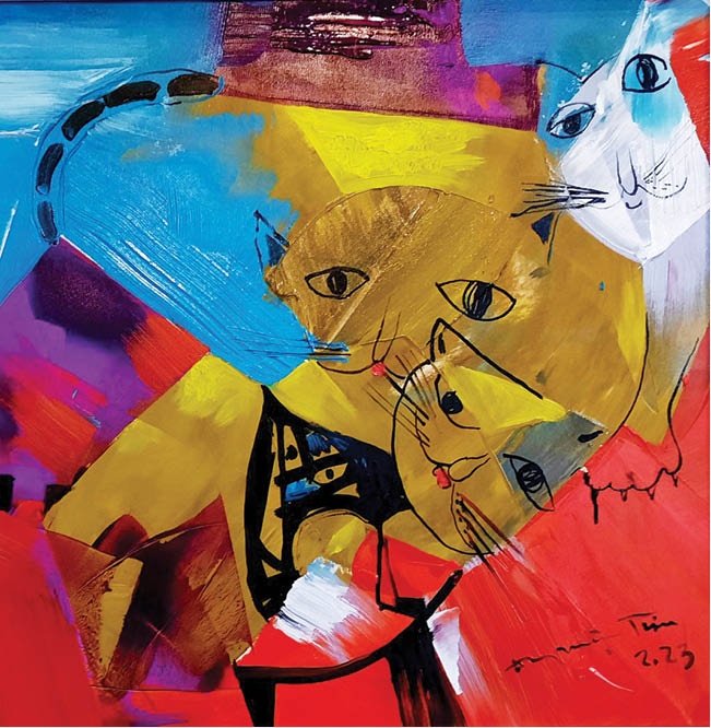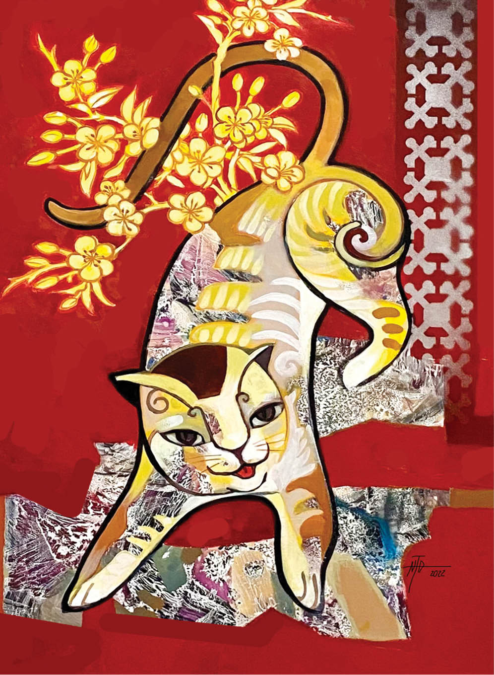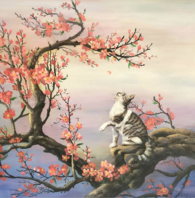 Ngoài phòng tranh con giáp của Art gallery Sông Như, những người yêu thích nghệ thuật còn được thưởng thức tranh con giáp tại phòng tranh “Mùa xuân và con giáp” do Hội Mỹ thuật tổ chức tại Tạp chí Sông Hương. Hình tượng con mèo rất đỗi thân quen được các tác giả thể hiện qua vẻ tinh nghịch, ngộ nghĩnh, hân hoan.