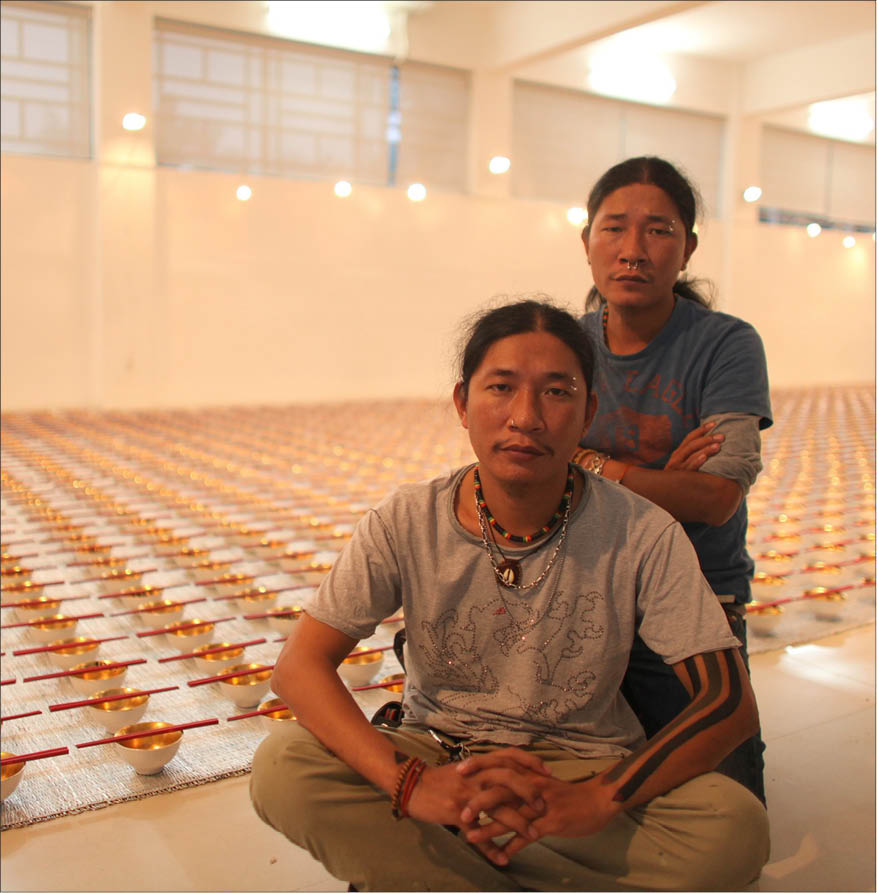 Anh em nghệ sĩ Lê Ngọc Thanh - Lê Đức Hải với tác phẩm sắp đặt “Chén và đũa (1945)”. Ảnh: NVCC