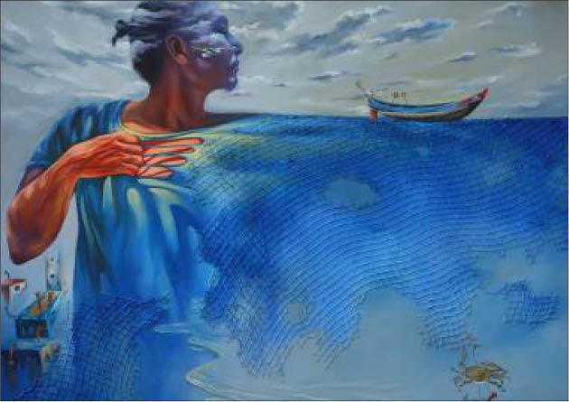 Sinh ra ở một vùng quê ven biển, từ thời thơ ấu đến giờ, Nguyễn Lương Sáng luôn ngắm nhìn biển mỗi ngày. Hình ảnh những con thuyền ra khơi, những bóng người cùng quang gánh lướt nhanh đôi chân trần trên cát luôn cuốn hút anh. Từ năm 2017 đến nay, anh gần như chỉ sáng tác về biển, những bức tranh mang nặng triết lý, biểu hình. Biển như tình yêu, cũng là sự ám ảnh khó buông dứt.