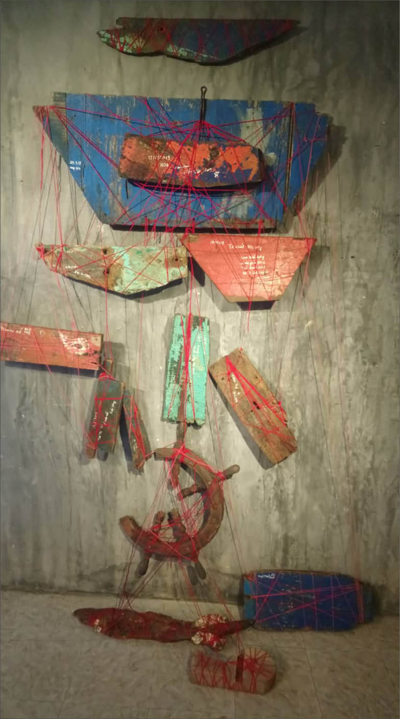 Ấn tượng với người xem hơn cả là các tác phẩm sắp đặt sử dụng chất liệu từ ván thuyền vỡ, gỗ thuyền, sắt… mà nghệ sĩ nhặt được trên biển Quảng Bình, Quảng Trị và Thừa Thiên Huế. “Chuyện biển 1” là câu chuyện kể về sự lênh đênh của những đồ vật, như đời người lênh đênh giữa những biến động mưu sinh. Hành trình của vạn vật trên biển cũng như hành trình của cuộc đời con người, có bắt đầu, có lênh đênh và có điểm kết thúc.