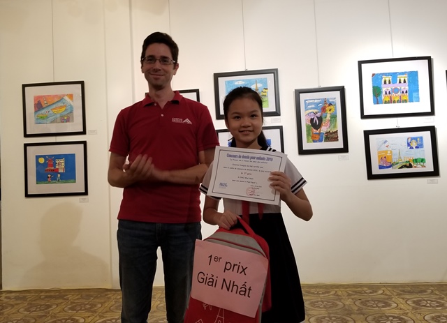 Triển lãm giới thiệu đến người xem 35 bức tranh đầy màu sắc vẽ về nước Pháp của các em học sinh Trường tiểu học Lê Lợi và Phú Hòa.