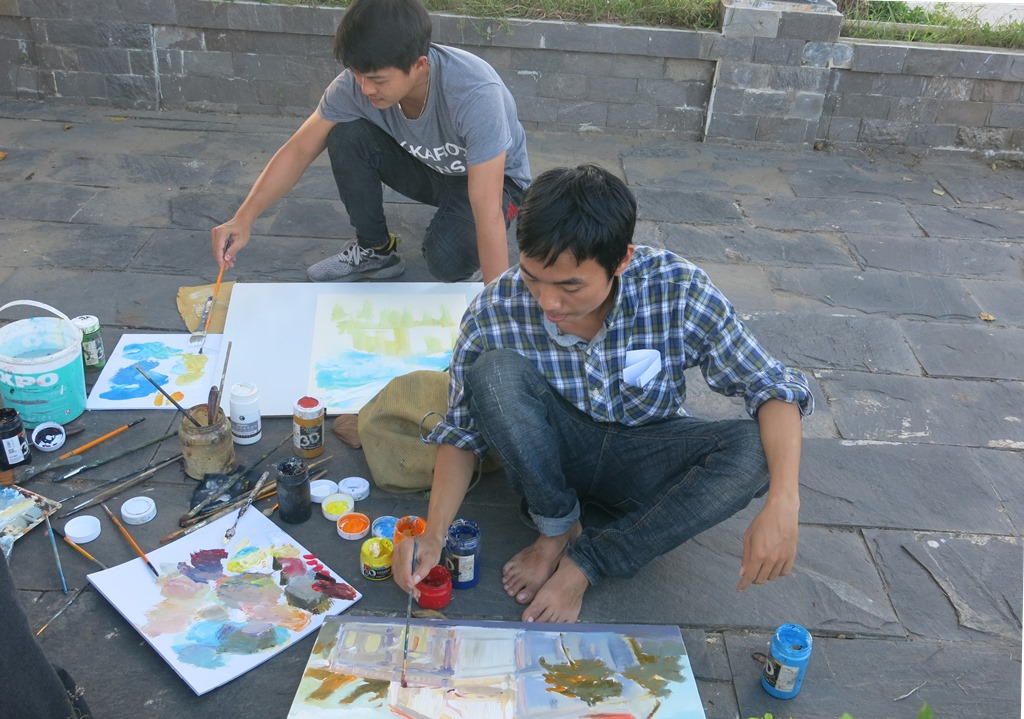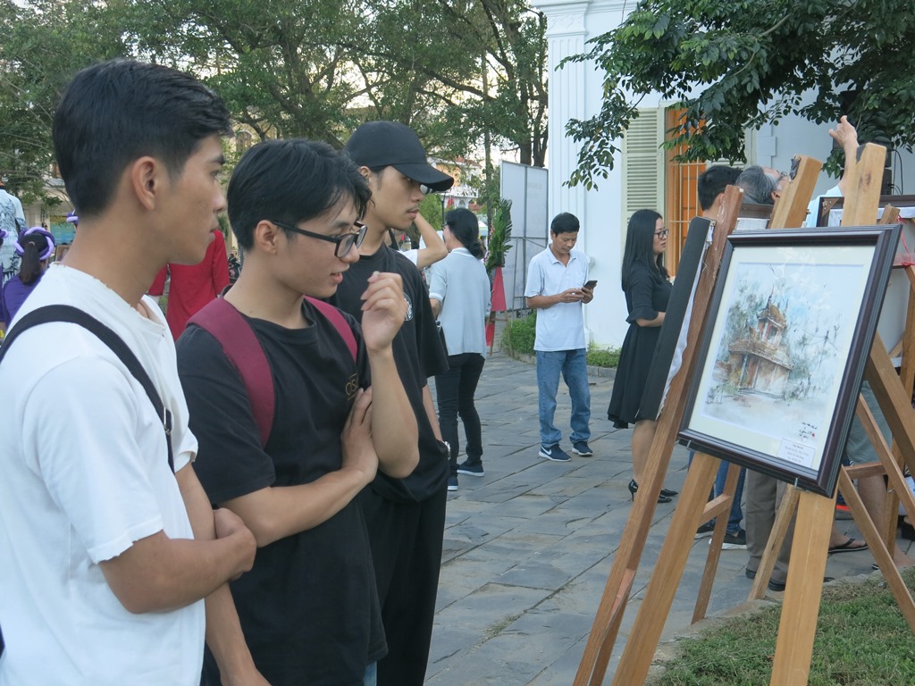 Các bạn trẻ thích thú với tác phẩm ký họa về di sản Huế