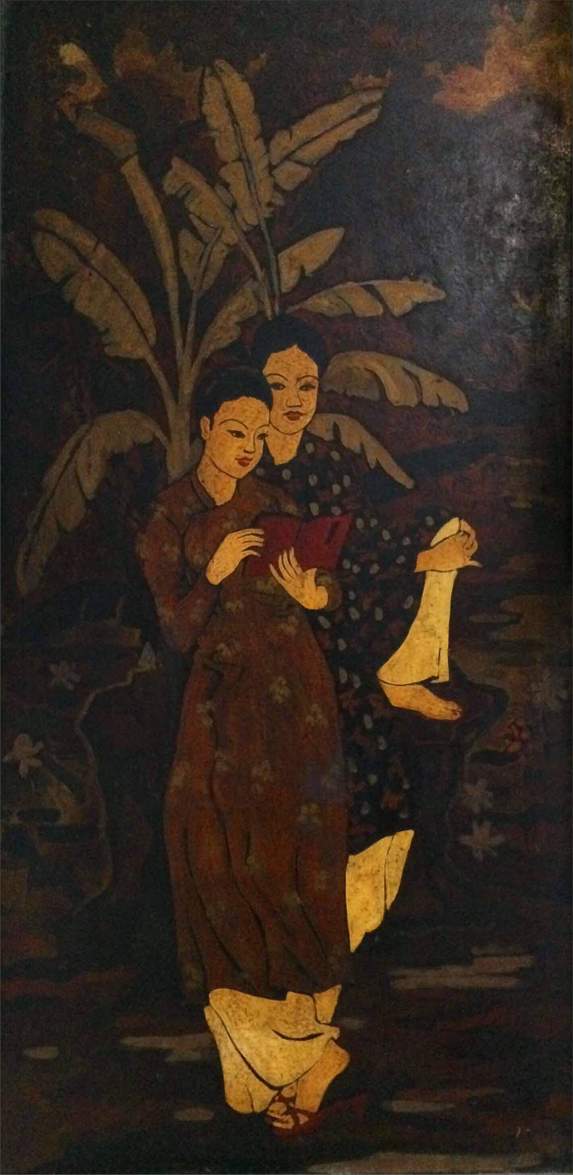 Với Thiếu nữ trong vườn (hình 2) bằng chất liệu sơn mài, Họa sĩ Tôn Thất Đào thể hiện một đôi bạn ở trong vườn đang cùng nhau đọc sách. Hai cô gái đều ăn vận áo dài, đầu đội mấn với tư thế khác nhau tạo nên sự sinh động cho tác phẩm.