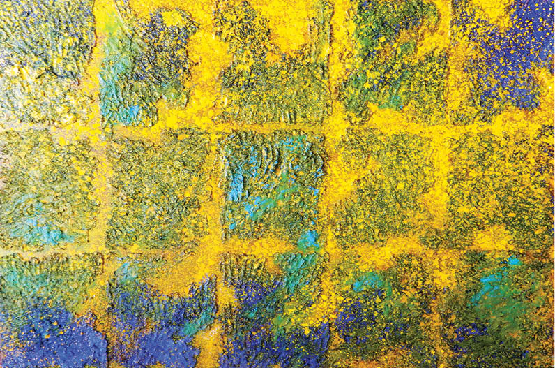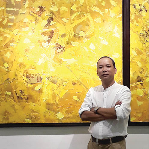 Khi bắt đầu vẽ seri vàng này, tôi hoàn toàn không nghĩ những điều trên, mà nó bắt đầu từ việc sửa một bức tranh bị hỏng, chuyển dần sang màu vàng, rồi thấy hay hay thì làm tiếp. Dĩ nhiên, càng về sau tôi càng nghiên cứu và xem lại để khai thác màu vàng sâu hơn. Câu hỏi của nhà báo ứng với một bức tranh tôi vừa vẽ xong đợt cuối năm rồi, lấy tên là “Điền”. Đó là sắc vàng của ruộng lúa, màu trộn ánh lên như bạc của hành Kim, từng lớp sơn khô tạo cảm giác như những thân cây khô trong hành Mộc, tầng tầng lớp lớp cuốn trào như sóng biển của hành Thuỷ, các dòng sơn dẻo quánh tuôn trào như những dòng nham thạch của hành Hoả... Và gồ ghề, lồi lõm, nâu trầm như mặt đất bao la của hành Thổ. Tạo ấn tượng của Ngũ hành tương sinh tương khắc, sinh lão bệnh tử của quy luật tự nhiên. Như khởi đầu và kết thúc cũng là đất.