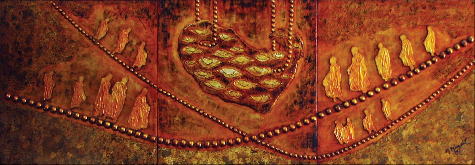 Với chùm tác phẩm về chủ đề Phật giáo, người họa sĩ trẻ lại thể hiện sự chiêm nghiệm về cuộc đời con người qua những lời dạy của đức Phật, quan niệm, triết lý của Phật giáo. Hình tượng các vị sư đi khất thực trong tác phẩm sơn mài “Hành trình tâm linh” là hành trình hướng về trí tuệ và lòng từ bi được thể hiện qua biểu tượng đôi mắt và trái tim. Những sắc vàng, sắc đỏ được tạo ra từ kỹ thuật nướng trứng, dán trứng, kỹ thuật đắp nổi của sơn mài gợi cho người xem không gian đặc trưng của đạo Phật. Với tác phẩm “Luân hồi”, Võ Quang Phát lại đề cập đến sự tái sinh từ kiếp này sang kiếp khác, từ cảnh giới này sang cảnh giới khác. Được thể hiện bằng các biểu chất trong tác phẩm, người xem có thể hình dung cảnh giới ấy đa đoan, sung sướng hay đau khổ…