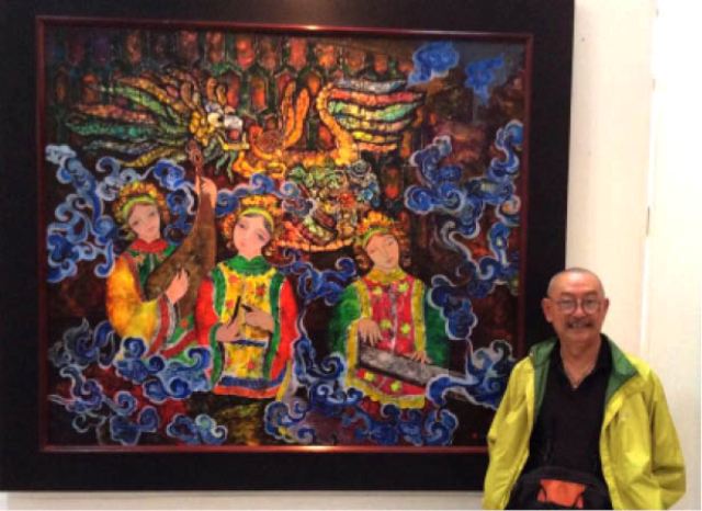 Hoạ sĩ Đặng Mậu Triết cùng tác phẩm Vọng 1 (chất liệu: sơn dầu – kích thước: 140.160 cm).