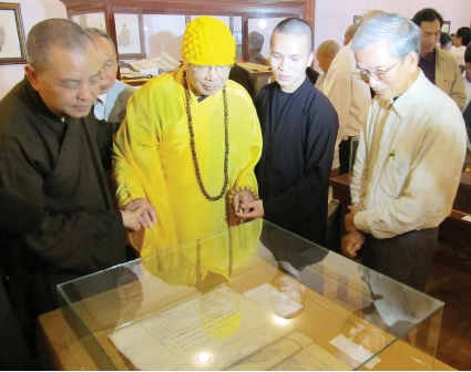 Hoà thượng Phó Pháp chủ GHPGVN, Trưởng Ban Trị sự Tỉnh hội PG Thừa Thiên Huế (thứ 2, trái sang) xem bộ Thích Thị Nguyên Lưu