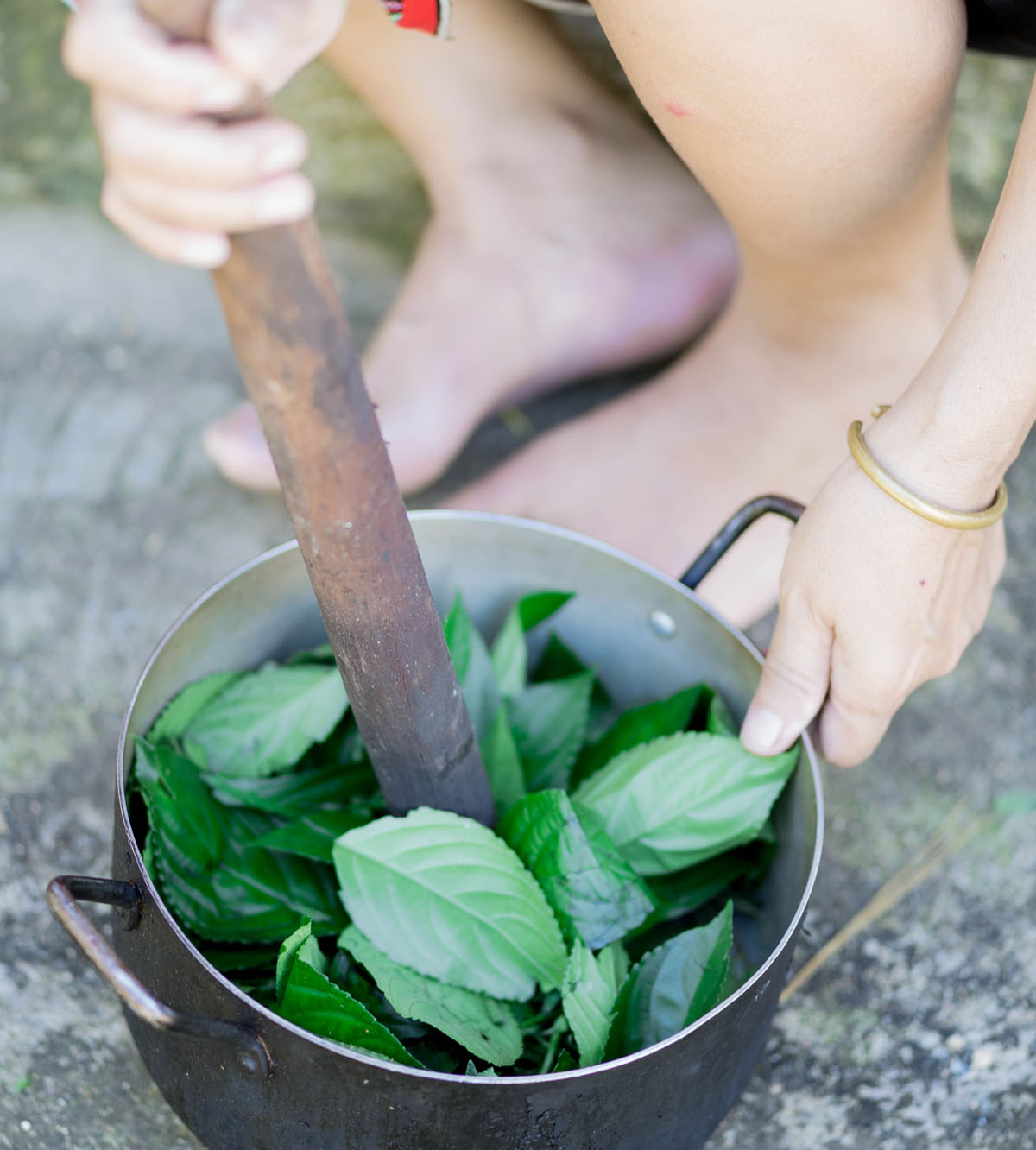 Lá A’rưh giã nhỏ quết dính như keo, trộn với vỏ ốc, nấu sẽ cho ra màu xanh, dùng tạo màu sợi chiếu