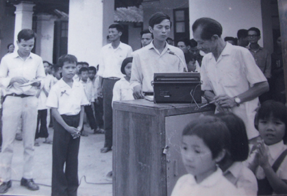 Ông Trần Duy Hưng ghé mắt đọc bài diễn văn chào mừng của lãnh đạo trường năm 1975