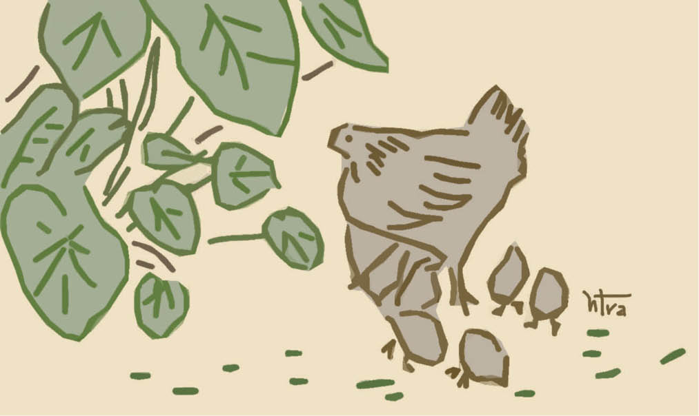 Sau nhà, lũ gà chen nhau đứng trong chuồng chờ người mở cửa, tiếng lục ca lục cục rộn rã cả góc vườn. Tiếng ông thì thầm với lũ gà trên sân khi thả xuống những nắm thóc vàng óng. Tiếng húng hắng ho rớt vào sớm mai còn đương se lạnh. Trước thềm nhà, vạt sương đêm ướt đẫm còn chưa kịp ráo. Mùi đất, mùi sương ngát lên thanh âm dịu ngọt.