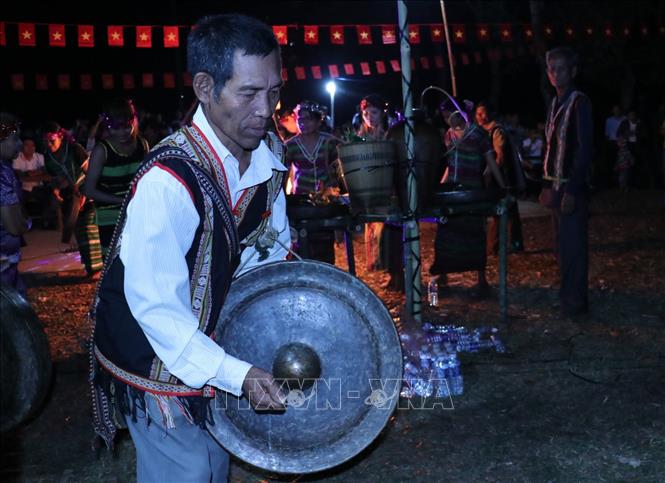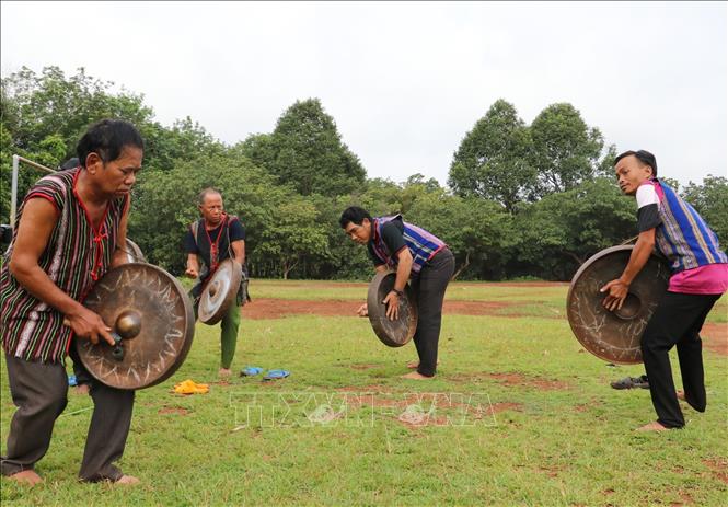 Biểu diễn cồng chiêng trong lễ hội mừng lúa mới của đồng bào S’tiêng.