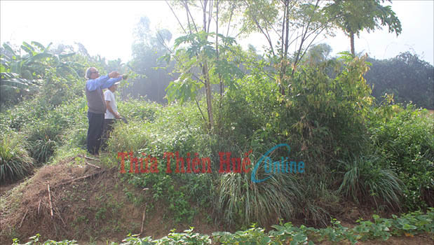 Nhà nghiên cứu Trần Viết Điền (thứ nhất) và ông Mai Khắc Chính tại cồn đất nguyên táng cụ Du Đức Hầu