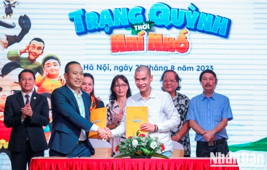 | Ông Tạ Mạnh Hoàng đại diện Sconnect (bên trái) và đạo diễn Trịnh Lâm Tùng đại diện Alpha Animation Studio (bên phải) ký kết thoả thuận hợp tác sản xuất phim. |