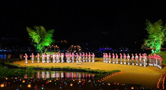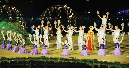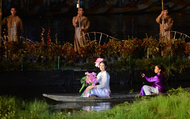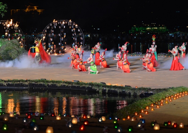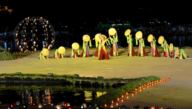 Đêm giã bạn, Huế rực rỡ đèn hoa. Sông Hương mênh mang trong làn khói huyền ảo, bập bùng trong ánh hoa đăng. Thời gian như dừng lại. Dòng sông cũng dùng dằng để thưởng thức bữa tiệc nghệ thuật lãng mạn như một lời chia tay ngọt ngào, đầy lưu luyến. Sân khấu bế mạc được thiết kế nổi trên sông Hương, dung dị nép mình bên bãi bồi cầu Gia Hội, dễ thương với nến, với sen, lũy tre, con đò, bến nước... Xa xa, cầu Trường Tiền “rực cháy” với nghệ thuật sắp đặt lửa của đoàn Carabosse. Ánh sáng của hàng ngàn ngọn nến soi bóng xuống dòng sông kết hợp với những quả cầu lửa nổi trên mặt nước khiến sông Hương, cầu Trường Tiền trở nên quyến rũ và huyền hoặc, tạo nên một không gian nghệ thuật ngoạn mục, làm say đắm khách thập phương.