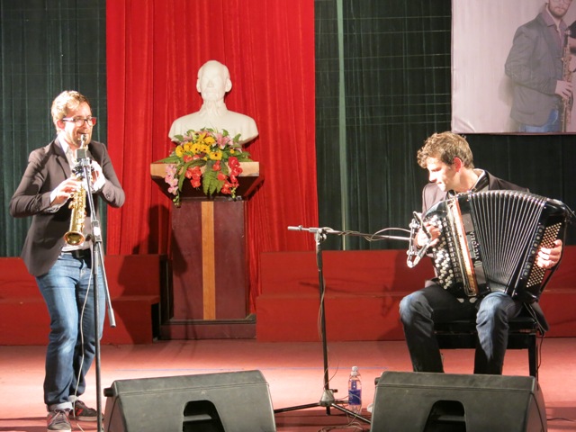 HNN.VN - Tối 18/9, tại Học viện Âm nhạc Huế diễn ra chương trình song tấu nhạc Jazz của Emile Parisien và Vincent Peirani đến từ Pháp. Chương trình do Trung tâm Văn hóa Pháp tại Huế và Học viện Âm nhạc Huế phối hợp tổ chức.