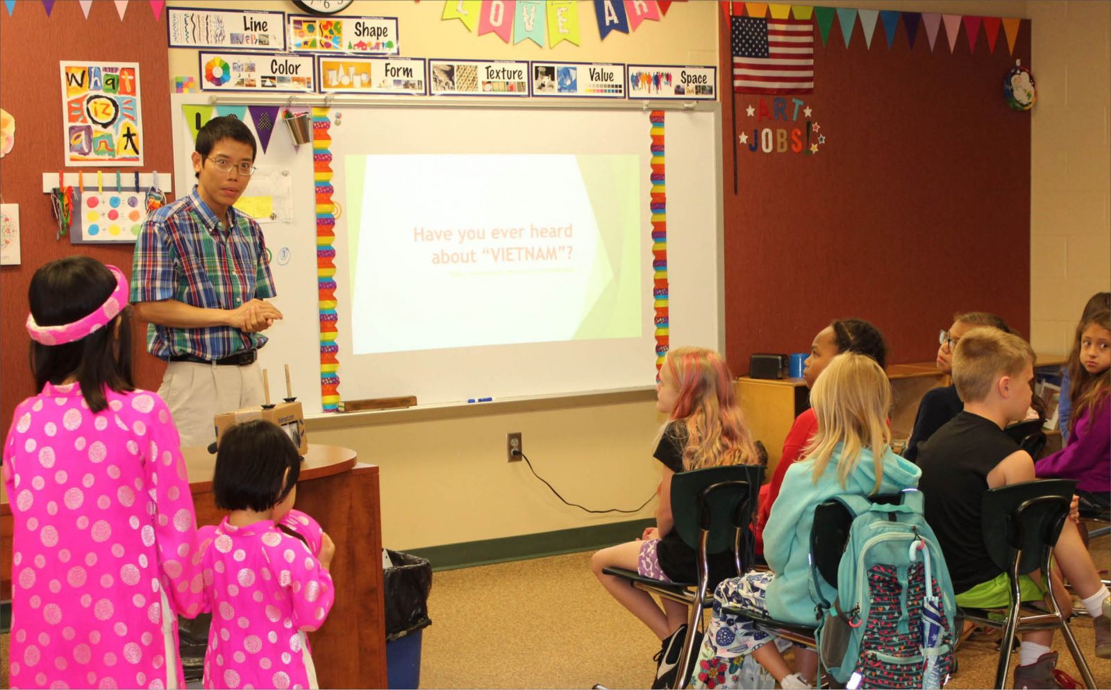 Tác giả nói chuyện với các bạn nhỏ Hoa Kỳ về văn hóa Việt Nam. Ảnh: Hà Linh