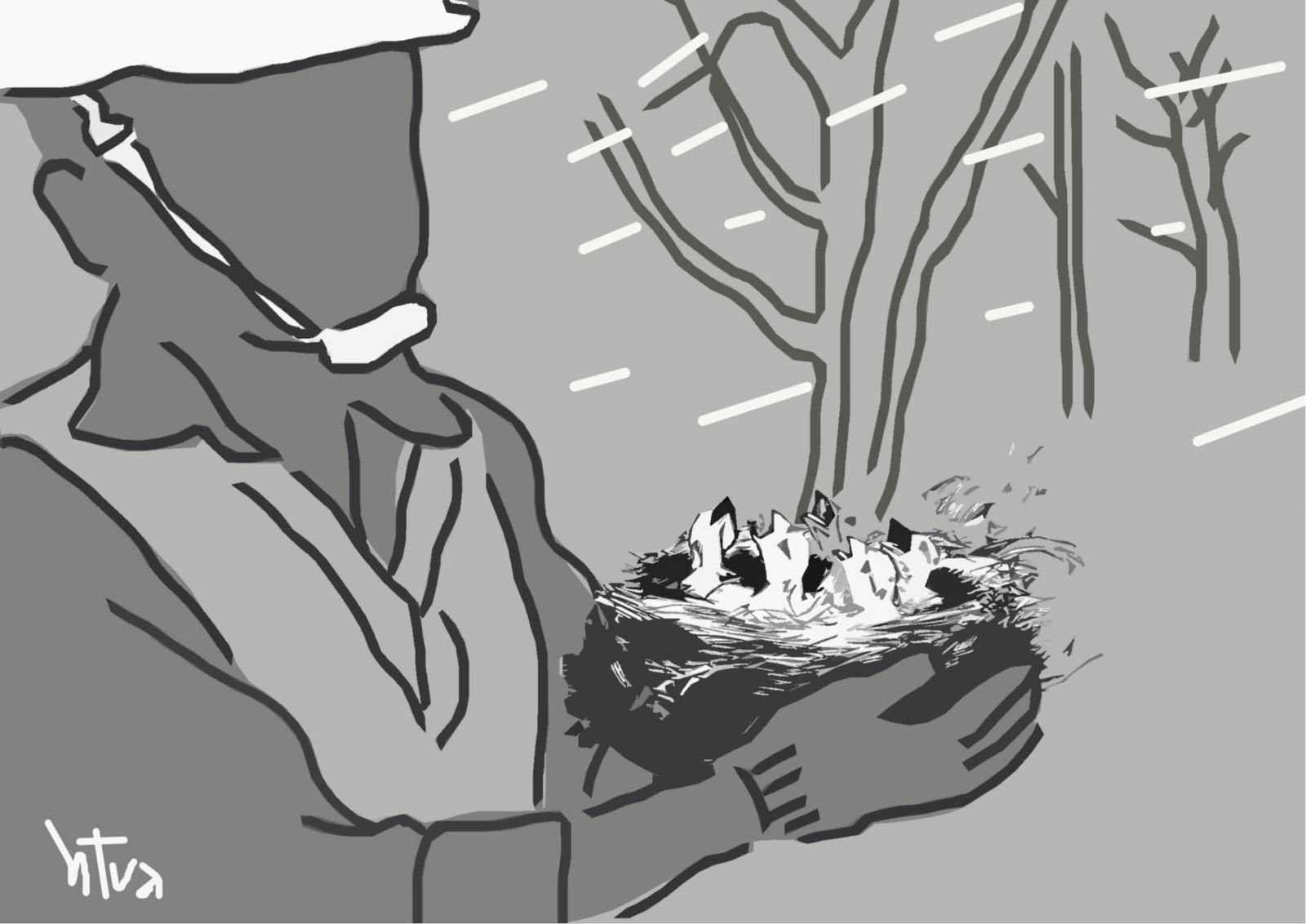 Sau khi phát các đường băng, lửa đã dần được khống chế. Nhưng thời tiết khô nóng nên có nhiều điểm cháy trở lại. Cũng có khi vừa dập xong chỗ này thì lại có tin chỗ khác rừng đã ngập trong biển lửa. Thuận chạy nhanh về phía rừng vừa mới phát lửa. Đây là khu vực rừng có nhiều cây bụi, lớp thực bì dày dễ bén lửa. Bỗng nhiên anh nghe thấy nhiều tiếng chim kêu hoảng loạn. Đó là tiếng chim con gọi mẹ trong cơn nguy hiểm. Thuận dùng máy thổi lửa rồi nhào vào bụi cây phía trước. Một tổ chim bé nhỏ nằm nép trong tán lá suýt chút nữa đã bị thiêu rụi. Lũ chim non nháo nhác há chiếc miệng đỏ hỏn ra kêu. Thuận lấy chiếc mũ cối đang đội trên đầu, ngửa ra, khẽ khàng đặt tổ chim vào đó. Thuận dốc những giọt nước cuối cùng trong chai cho những chú chim. Mẹ của chúng giờ này có thể đang chấp chới, hoảng loạn trong biển lửa. Cũng có thể vì khoảng rừng bị cháy quá rộng nên nó bị mất dấu đường về. Thuận nhớ tới hình ảnh những chú chim non nằm chết đói trong tổ mà ai đó đăng trên facebook với lời kêu gọi “đừng bẫy chim mùa sinh sản”.