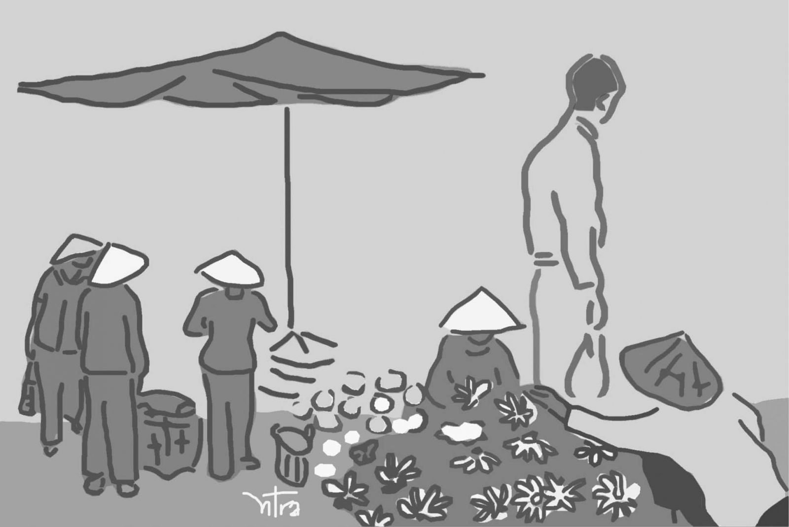 Khi không cưỡng được ý muốn, anh đưa tay lật qua lật lại mấy lát cá thu tươi dong trên cái mẹt rồi rụt rè hỏi mua. Nghe hô giá, anh rụt tay, giật mình, buột miệng kêu lên “đắt quá” rồi bỏ đi. Chị ném theo ánh mắt sắc như mũi nhọn cùng những lời sỉ nhục: “Không có tiền, đừng sờ vô! Vừa mới mở hàng, đã ám rồi!”. Anh quay lại ngó sững rồi xoay người, bước vội. Kẻ nhìn theo lầm bầm chì chiết: “Đàn ông tranh phần đi chợ của vợ, chắc lại đo lọ nước mắm, đếm củ dưa hành!”.