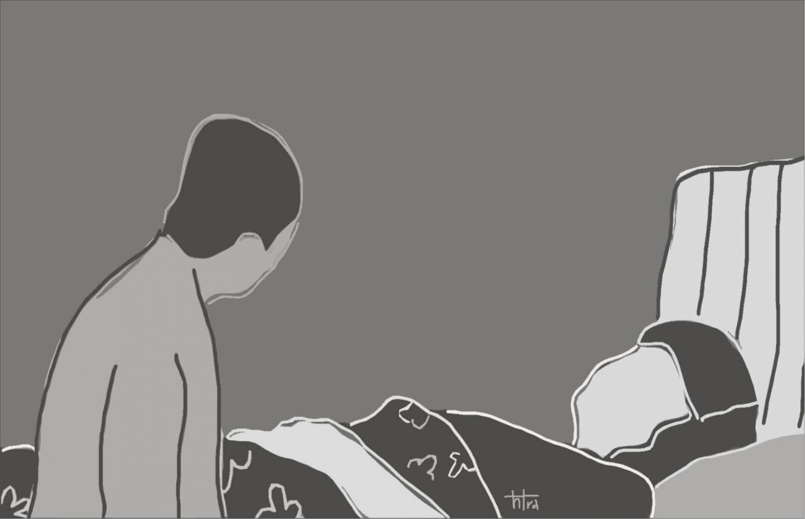 Bà choàng tỉnh. Giật mình ngơ ngác. Bàn tay vẫn nắm chặt một bàn tay. Người bác sĩ để tay mình nằm yên trong tay bà. Anh ra hiệu bảo bà nằm xuống.