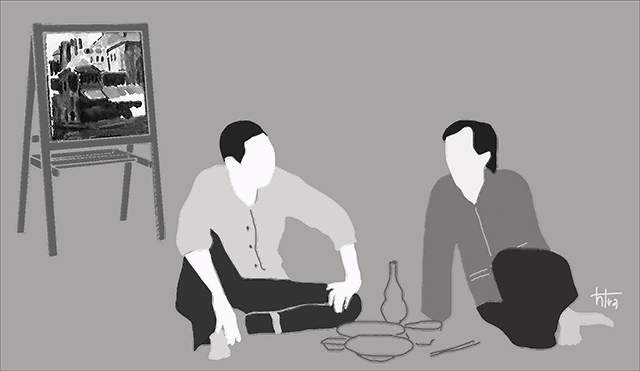 Ông Tân im lặng nghe chuyện, nhưng vẫn hớp đều từng ngụm rượu. Đôi mắt đăm chiêu dần theo từng sự việc xảy ra với người họa sĩ trước mặt ông mà không nói nên lời. Rượu càng cay, chuyện càng đắng. Mưa cứ lất phất bay.