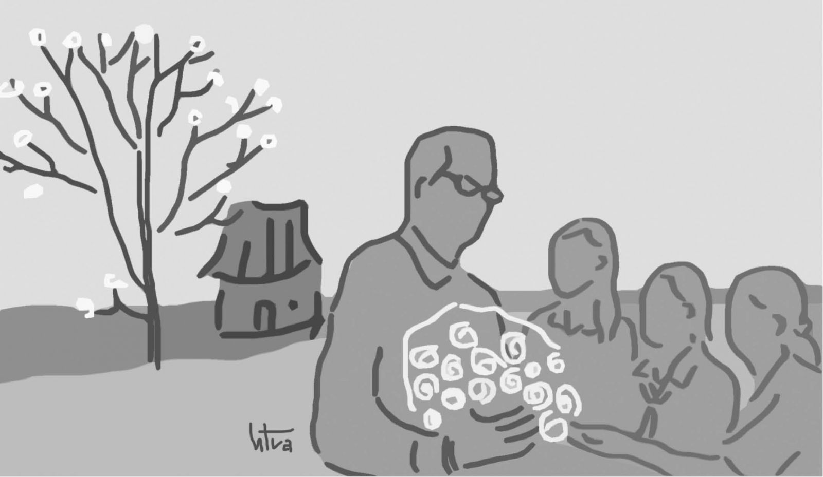Nhà thầy Sinh nằm giữa đồng, chơ vơ ba gian vách đất, mái lợp tôn. Được cái vườn xung quanh rộng, trồng nhiều cây ăn trái. Thầy Sinh chưa vợ, sống cùng mẹ già. Lâu lâu nhà có khách, nghe lũ nhỏ ào lại vòng tay ríu rít “con chào nội”, mẹ thầy xem chừng vui lắm, cứ gật lia gật lịa, miệng tấm tắc: Trời, con cái nhà ai mà ngoan quá? Dạ, học trò con đó mẹ. À, ừ, học trò, học trò ngoan… Cụ lại gục gặc đầu, cười phô hai hàm răng chỉ còn lợi đỏ…