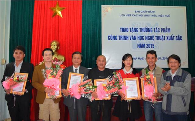 Nhà văn Hồ Đăng Thanh Ngọc - PCT Liên hiệp các Hội VHNT TT Huế - trao tặng hoa và bằng chứng nhận cho các tác giả đạt giải. Ảnh: Internet