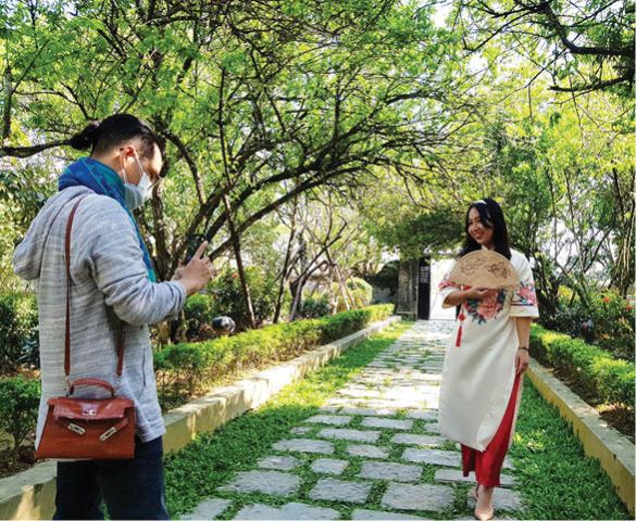 Bạn trẻ chụp hình kỷ niệm ở đường dẫn lối vào ngôi nhà