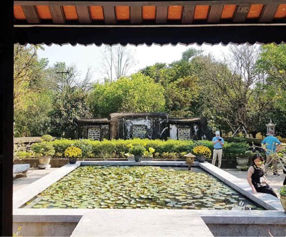 Vừa dừng xe ở phía trước, cánh cổng rêu phong cổ kính hiện ra, tạo cho du khách sự tò mò nhất định về những gì tồn tại ở bên trong đó. Bước qua cánh cổng với hàng chè tàu thẳng tắp, một cảm giác bình yên, thư thả bởi một mảng xanh của hoa trái đan xen, rợp lối đi từ ngoài vào bên trong ngôi nhà rường ba gian hai chái nằm khuất sau bức bình phong.