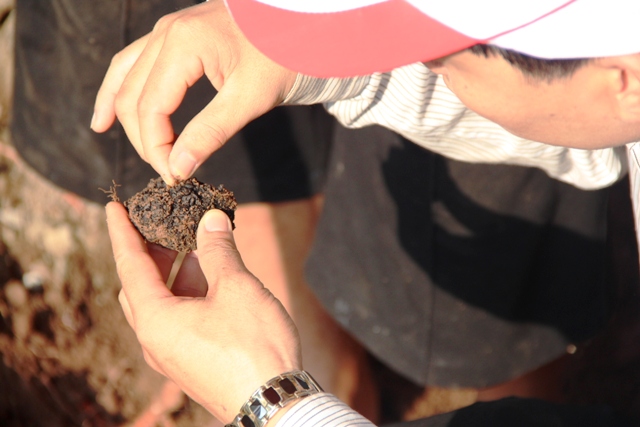 Một chuyên gia nghiên cứu lớp đất đào lên ở hố thăm dò