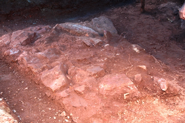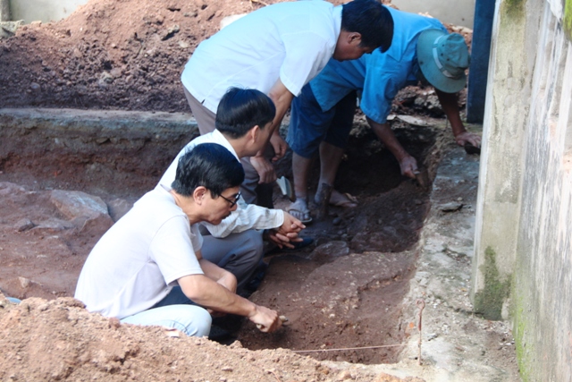 Cụ thể, ở hố này, sau khi đào lớp đất bề mặt xuống sâu chừng 40cm, các chuyên gia phát hiện nhiều tảng đá xếp chồng với nhau theo hình chữ L. Ở đoạn cuối những tảng đá này xuất hiện các lớp vôi. Ngay sau đó, đoàn thăm dò cho đào mở rộng hố để tiếp tục thăm dò, nghiên cứu.