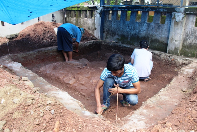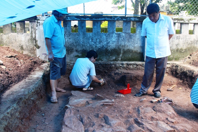 PGS.TS Bùi Văn Liêm, Viện phó Viện Khảo cổ học (bìa phải) quan sát lớp đá sau khi đào từ bề mặt xuống khoảng chừng 40cm