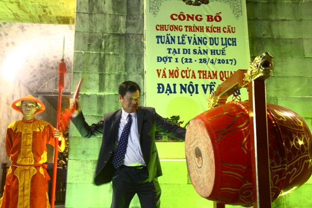 Ông Nguyễn Dung, Phó Chủ tịch UBND tỉnh đánh trống bắt đầu chương trình mở cửa Đại Nội về đêm