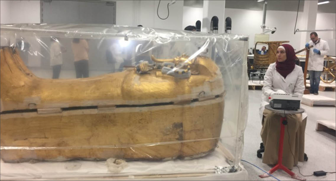 Sau khi được chuyển cẩn thận từ ngôi mộ của Tutankhamun tại Thung lũng các vị vua, các nhân viên phục chế thuộc Đại Bảo tàng Ai Cập (GEM) đã bắt đầu xì khói khử trùng lớp gỗ của chiếc quan tài mạ vàng. Được biết món cổ vật đã hư hại đến 30% với nhiều vết nứt, nhiều phần thân bị thiếu.