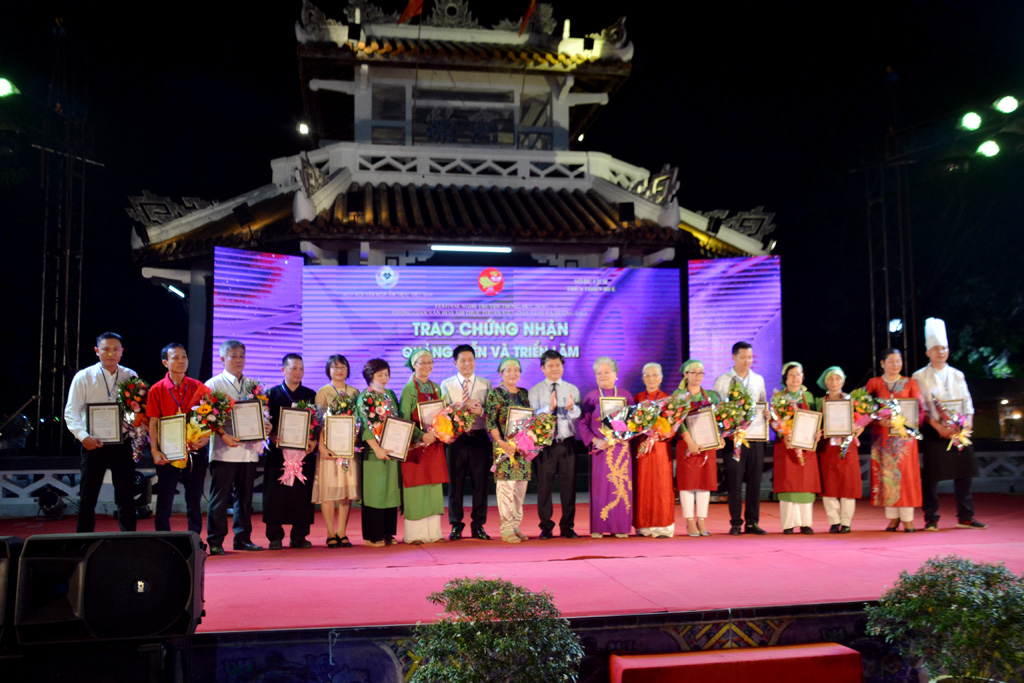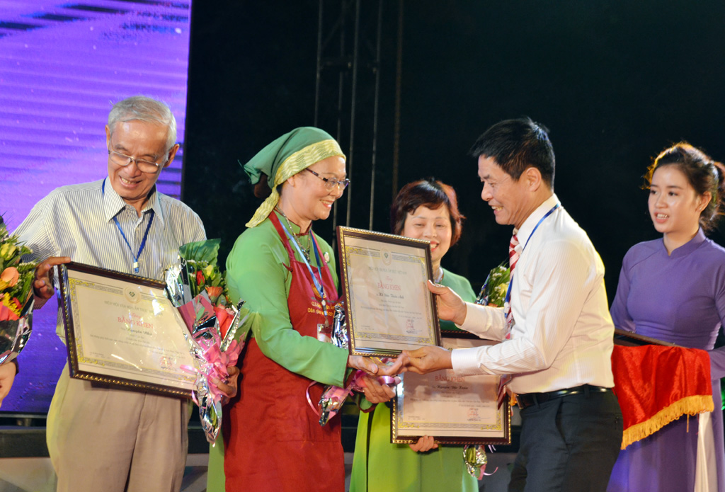Ông Nguyễn Quốc Kỳ, Chủ tịch Hiệp hội Văn hóa ẩm thực Việt Nam trao giấy chứng nhận cho các nghệ nhân, chuyên gia ẩm thực tham gia “Không gian văn hóa ẩm thực thuần Việt”