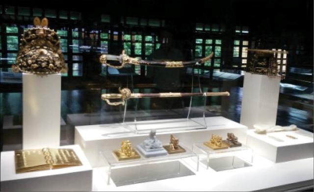 Đó là các hiện vật biểu trưng cho tính chính thống và quyền lực tối cao của các hoàng đế triều Nguyễn như: ấn, kiếm, kim sách, mũ miện... Trong đó ấn, kiếm được coi là trọng khí của quốc gia, là vật bảo chứng cho sự hiện diện và xác nhận ý chí, mệnh lệnh của hoàng đế. Những bảo vật này không phải ai cũng may mắn được diện kiến, kể cả các quan lại. Một quy định của vua Minh Mạng được ban hành năm 1837 đã ghi rõ: “Bảo tỷ là khí cụ quan trọng của Nhà nước, từ trước đến nay vẫn tôn trí ở điện Trung Hòa, trừ khi có việc cần đóng ấn nào thì triều thần mới làm sớ tâu lên xin phép vua, rồi cho các Thái giám bưng ra để dùng, còn các đại thần ở ngoại đình thì ít người được trông thấy. Tuy điện Trung Hòa là nơi ngày đêm Trẫm ở, nhất quyết không có chuyện bất trắc xảy ra, nhưng bảo tỷ là khí cụ rất quan trọng, không nên chỉ để cho đàn bà và hoạn quan dự biết, như thế chẳng phải là phép tốt để dạy bảo muôn đời” [1] .