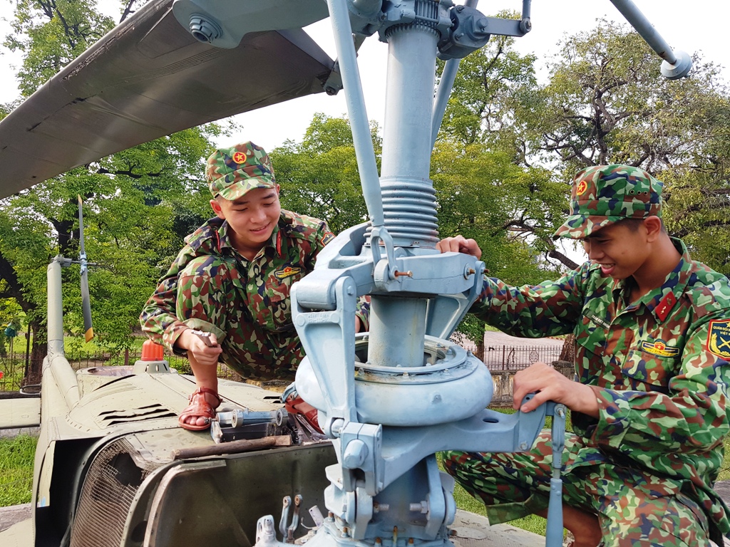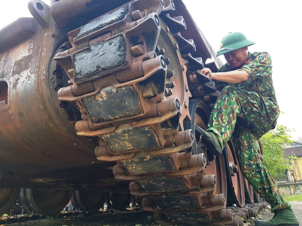 Một chiến sĩ đang thao tác tháo ốc vít ở chiếc xe tăng