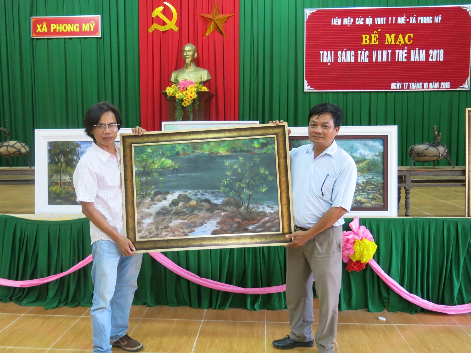 Họa sỹ Nguyễn Đăng Sơn - người con Phong Mỹ trao tác phẩm sáng tác “ Bến Khe Trăn" cho lãnh đạo UBND xã Phong Mỹ