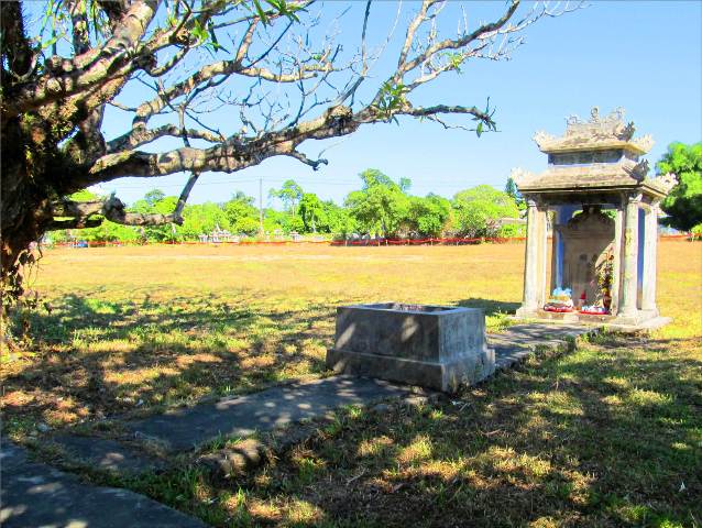 Tấm bia mộ và cồn mồ 8 làng tại chùa Ba Đồn. Ảnh: HK