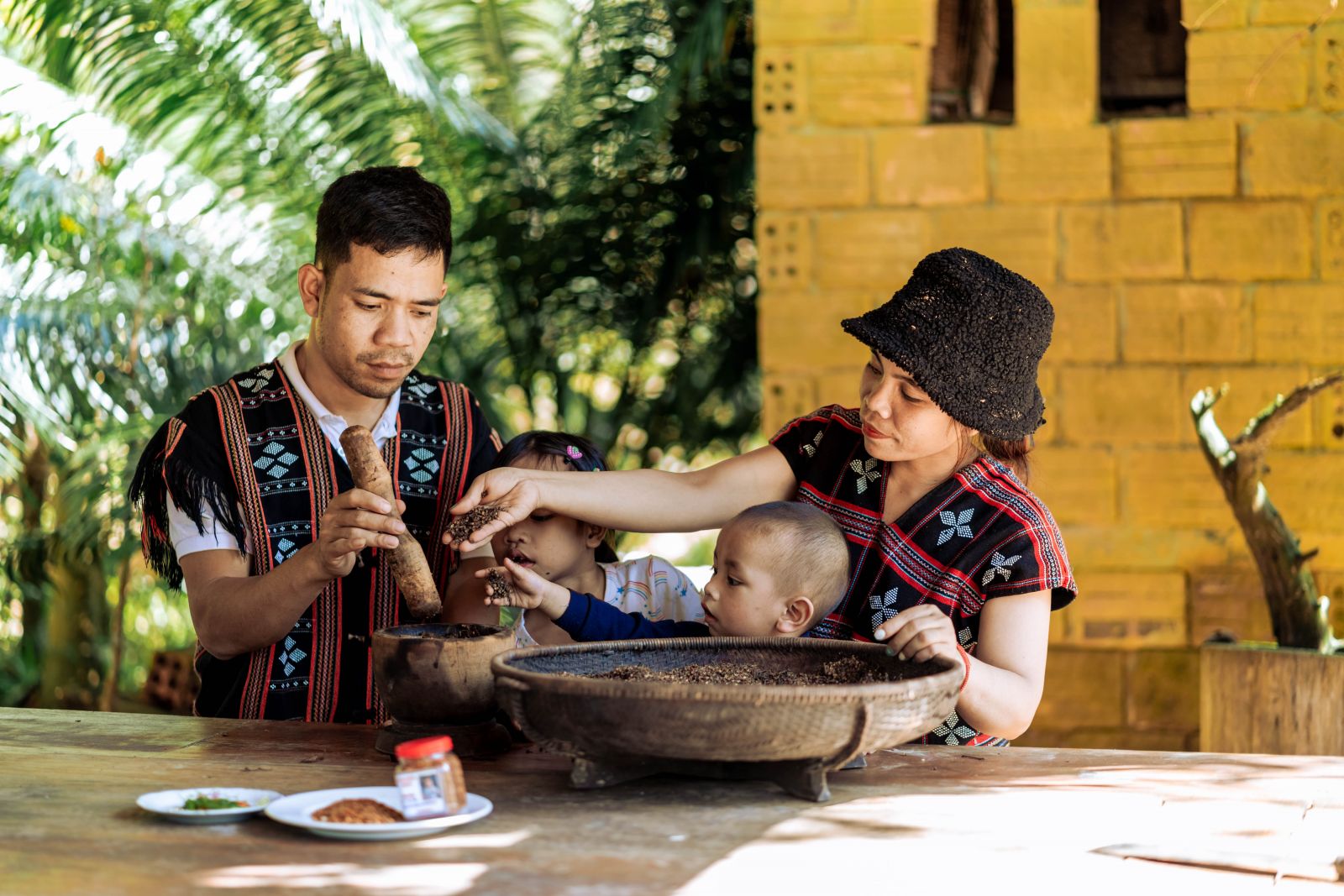 Trẻ con trong nhà làm cùng ông bà, bố mẹ, học cách nhận biết tác dụng các loại lá, củ rừng
