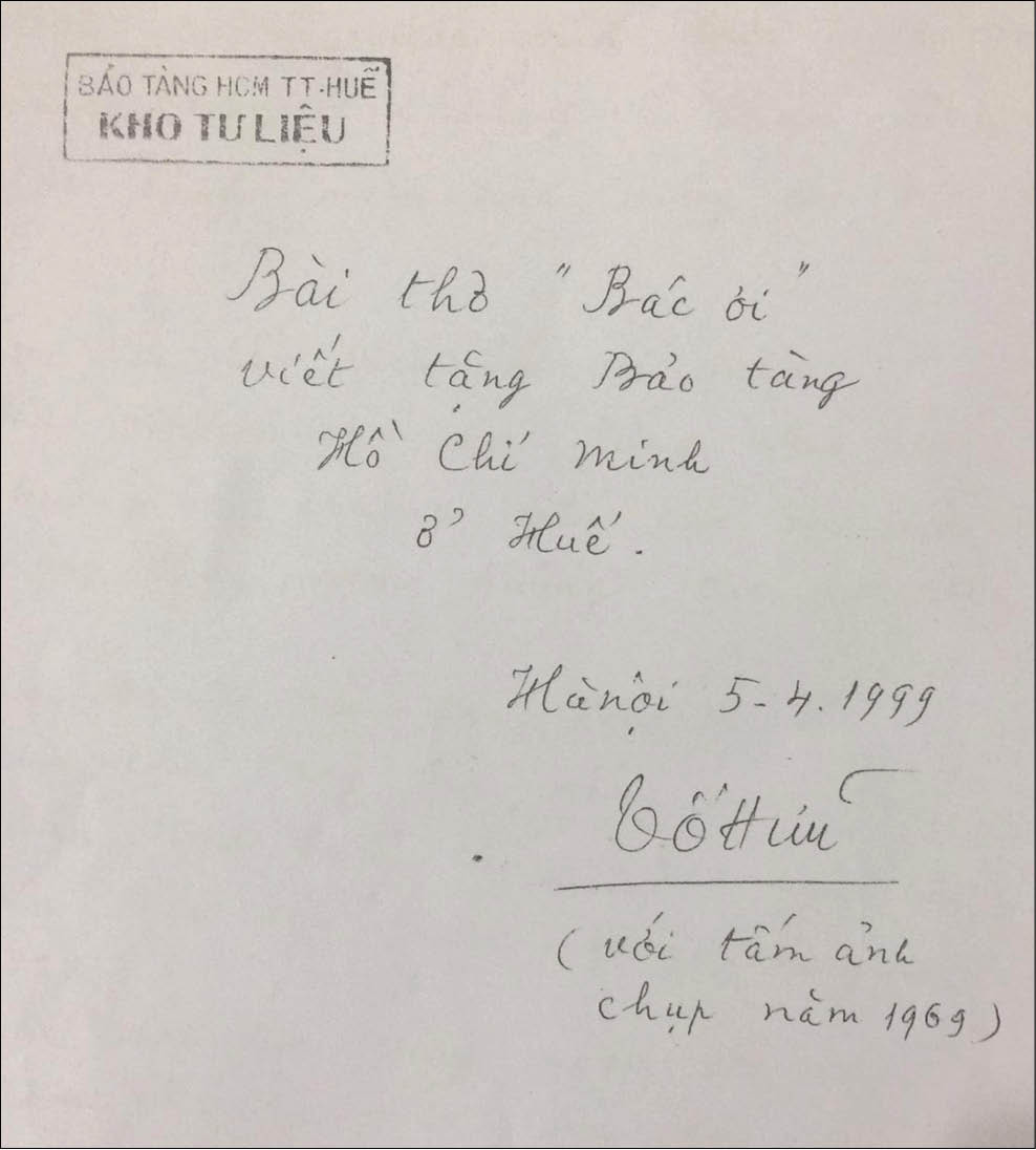 Điều đó chắc nhiều người đã biết và cảm nhận hơn thế nữa, nhưng về bút tích bài thơ "Bác ơi" của nhà thơ Tố Hữu thì chưa hẳn ai cũng biết. Bút tích bài thơ này do nhà thơ Tố Hữu viết tặng Bảo tàng Hồ Chí Minh Thừa Thiên Huế, với đề tựa “Bài thơ Bác ơi viết tặng Bảo tàng Hồ Chí Minh ở Huế” (Hà Nội 5-4 -1999, kèm theo tấm ảnh chân dung của nhà thơ chụp năm 1969). Có một sự trùng hợp ngẫu nhiên là thời điểm nhà thơ viết tặng bài thơ "Bác ơi", ông cũng vừa bước sang tuổi 79. Chị Lê Thị Kim Yến (Nguyên Trưởng phòng Nghiệp vụ Bảo tàng Hồ Chí Minh Thừa Thiên Huế, nay đã nghỉ hưu) là người đã đến tại nhà riêng của nhà thơ để nhận tận tay bà Vũ Thị Thanh (vợ nhà thơ) bản bút tích bài thơ "Bác ơi" kèm theo tấm ảnh chân dung Tố Hữu, cuối tháng 4 năm 1999. Đây không chỉ là tình cảm của nhà thơ dành tặng cho Bảo tàng Hồ Chí Minh Thừa Thiên Huế, mà còn là tấm lòng đau đáu của một người con đối với quê hương mình. Cũng theo bà Nguyễn Minh Hồng, một bảo tàng nhà thơ Tố Hữu dự kiến sẽ được gia đình chính thức khánh thành vào tháng 10 năm sau (năm 2020) nhân kỷ niệm 100 năm ngày sinh Tố Hữu. Nếu trong nội dung trưng bày của Bảo tàng này không có bút tích bản thảo bài thơ “Bác ơi”, thì bút tích bài thơ "Bác ơi" của nhà thơ Tố Hữu hiện đang trưng bày ở Bảo tàng Hồ Chí Minh Thừa Thiên Huế, gần như “độc nhất vô nhị”. Nó không chỉ quý hiếm về góc độ hiện vật bảo tàng, mà còn chứa đựng trong đó tình cảm sâu nặng của nhà thơ và của cả Nhân dân Thừa Thiên Huế với Bác Hồ kính yêu.