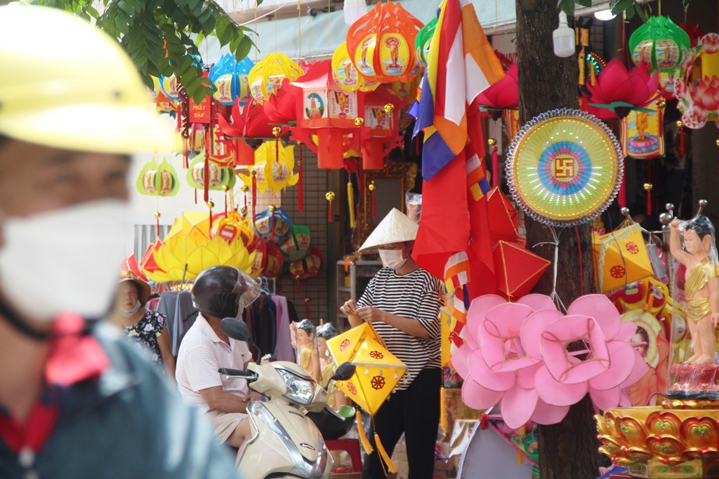 Tại một số tuyến phố chuyên bán vật dụng trang trí Đại lễ Phật đản nhộn nhịp cảnh mua bán.