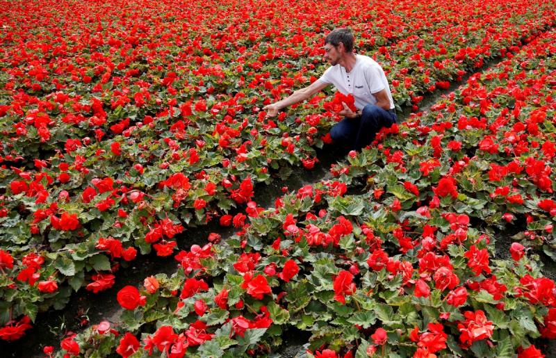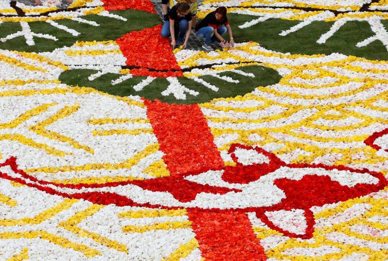 Hơn 100 công nhân và tình nguyện viên tham gia "dệt" tấm thảm hoa. Ảnh: Reuters