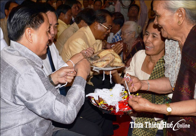Buộc chỉ tay cầu phúc- một phong tục đẹp mỗi dịp tết của người Lào. Ảnh: DT