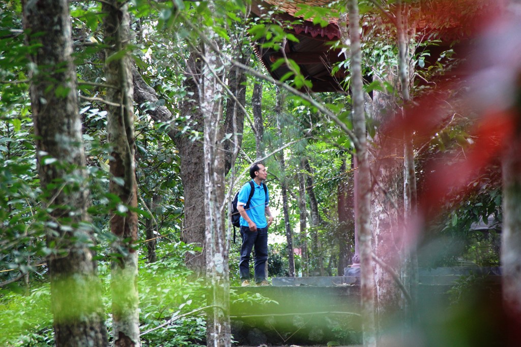 Du khách tham quan bên trong khuôn viên chùa, dưới những tán cây xanh rậm rạp rất mát mẻ