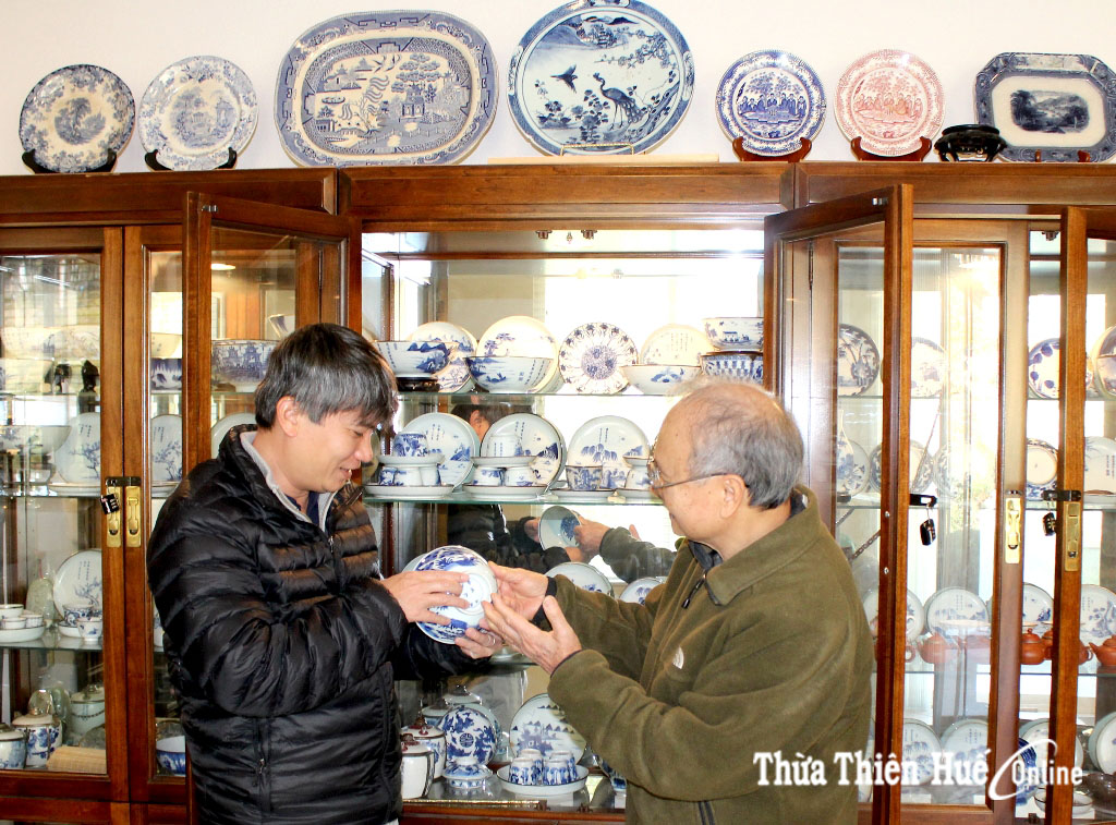 Cuối năm 2015, tôi có chuyến du lịch đến Nam California. Anh Hoàng Đại Lệ hay tin, liền mời tôi về nhà anh ở Lake Elsinore để xem sưu tập đồ cổ xứ Huế mà anh dày công sưu tầm trong mấy chục năm qua. Anh kể, khi gia đình tôi còn ở Huế, trong nhà có chưng mấy món đồ cổ, phần lớn là đồ Tây, như đồng hồ, gốm xốp, đồ gỗ nội thất… nên tôi đã biết đến đồ cổ từ khi còn trẻ. Hồi đó, đồ bleus de Hué ít người biết, vì đa phần đều được cất giữ trong cung điện của vua chúa. Mãi sau này vô Sài Gòn, đọc bộ sách của cụ Vương Hồng Sển, trong đó có mấy quyển viết về đồ sứ Tàu và đồ bleus de Hué nên tôi mới biết đến dòng đồ sứ ký kiểu này. Từ đó sinh ham, đi đâu cũng ngó nghiêng, tìm mua đồ bleus de Huế đem về chưng trong nhà, như là hoài niệm về những tháng ngày sinh sống ở Huế. Tích lũy lâu ngày thì cũng ra sưu tập.