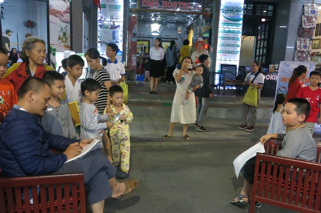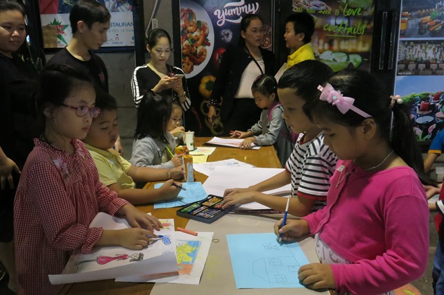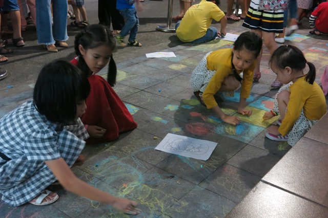 Mang theo bút màu và giấy vẽ, các bé tỏ ra thích thú khi được vẽ tranh ở một khu phố nhộn nhịp. Ở một góc bên cạnh, nhiều bé khác được hóa thân thành nghệ sĩ đường phố khi vẽ phấn lên vỉa hè những chủ đề về gia đình, bạn bè, trường lớp… Cũng trong không gian này, nhiều trẻ em được họa sĩ Hoàng Thanh Phong ký họa chân dung ngay trên đường phố.
