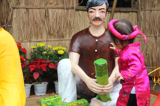 Bé Nhím (hơn 1 tuổi) lạ lẫm với tạo hình mô phỏng công đoạn làm bánh tét